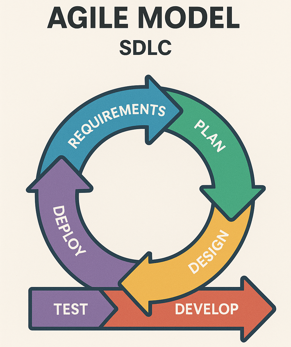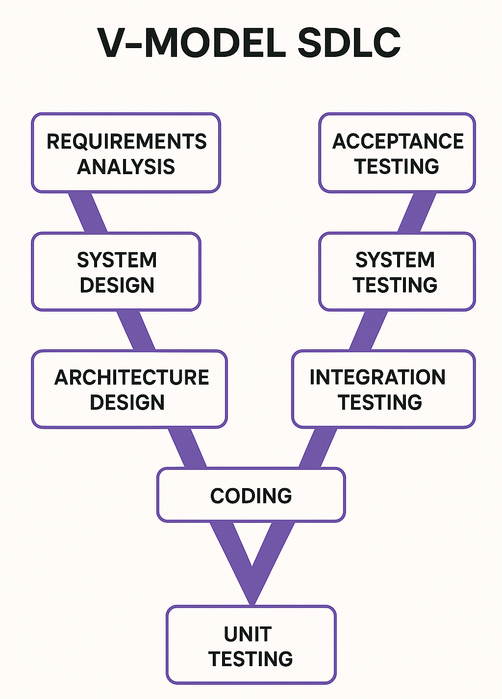 The V-Model (also called the Verification and Validation Model) is an extension of the Waterfall Model but focuses more on testing at each phase of the development process. It’s called the V-Model because the process follows a V-shape, where the left side represents development stages (Verification) and the right side represents corresponding testing stages (Validation).