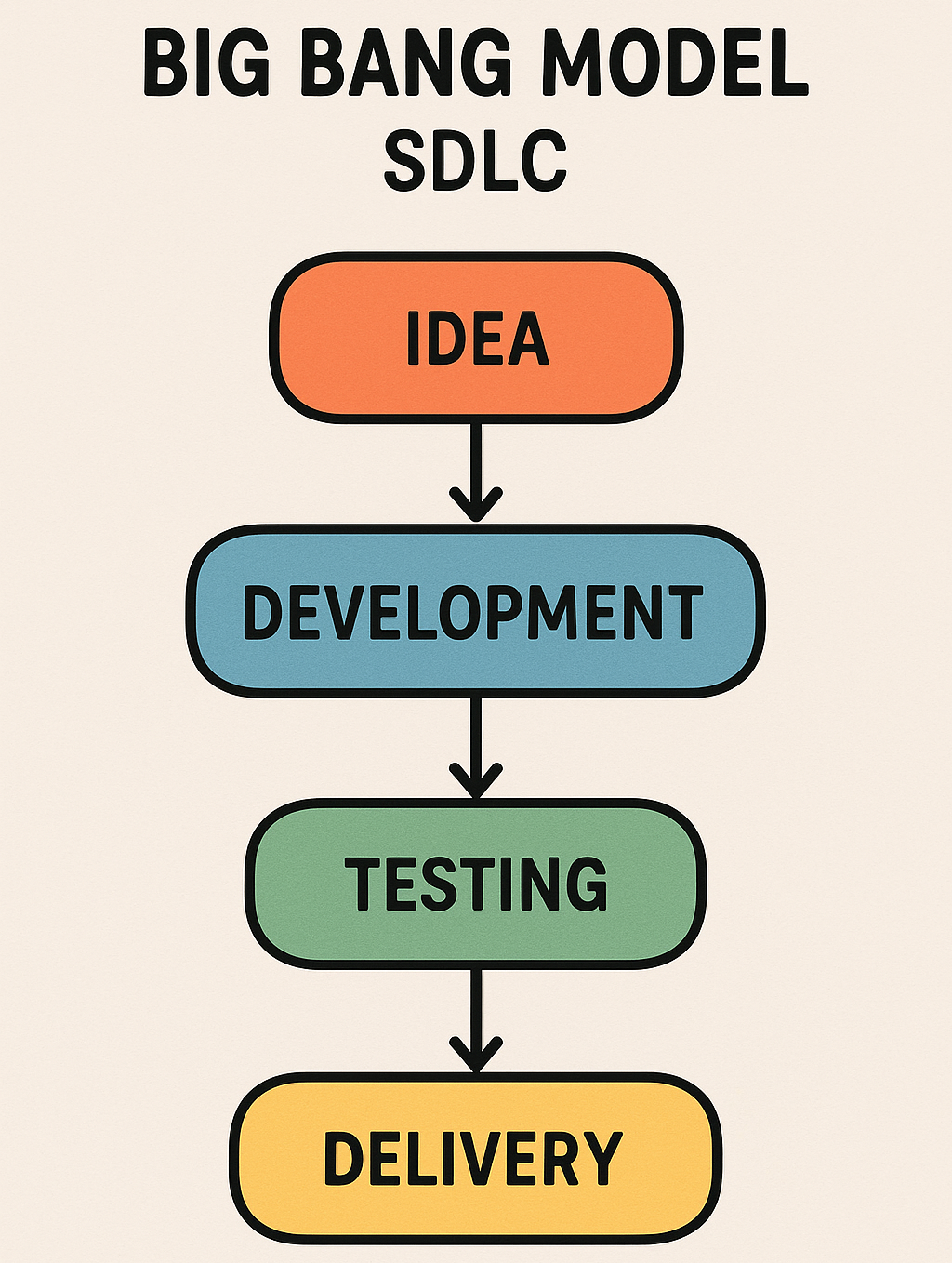 The Big Bang Model in Software Development Life Cycle (SDLC) is a less structured and simple approach to developing software. It is typically used for small projects or projects where the requirements are unclear or rapidly changing. In the Big Bang Model, there is minimal planning, and most of the focus is on coding and development.