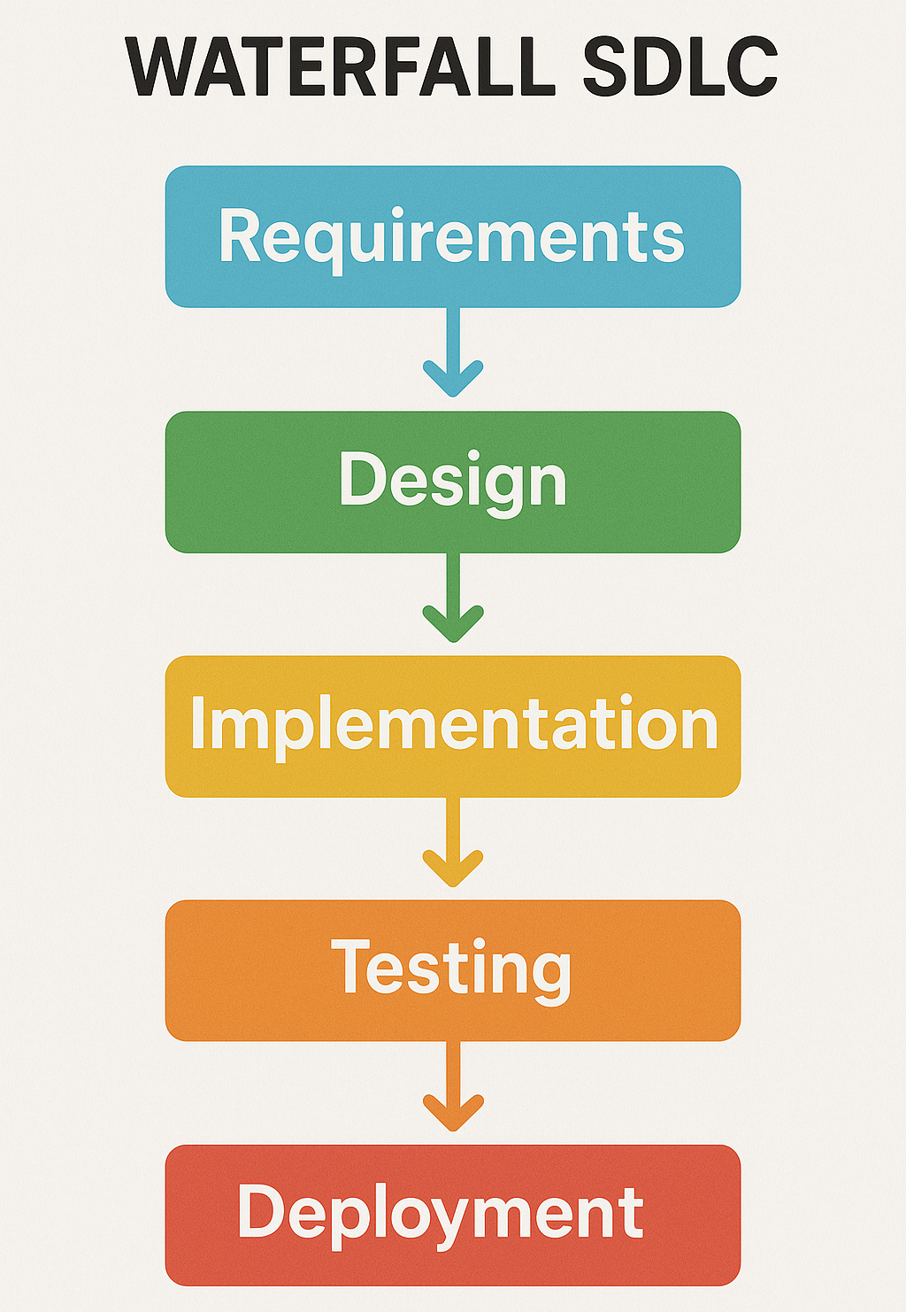 - The Waterfall Model is one of the oldest and simplest approaches to the Software Development Life Cycle (SDLC). It follows a linear and sequential process, where each phase depends on the completion of the previous one. Imagine it like water flowing down a set of steps - once you move from one step to the next, you don’t go back up.