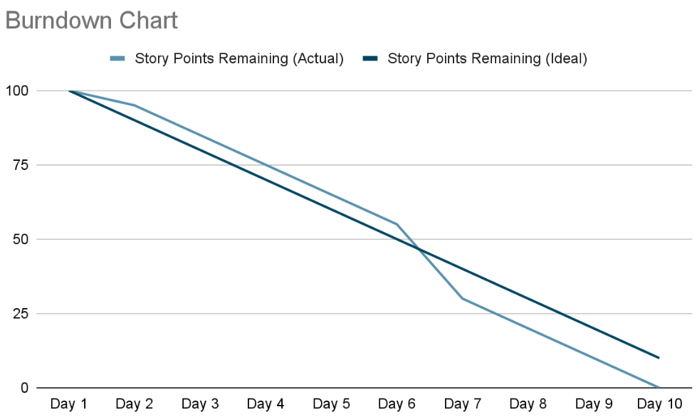 Let's assume we have a 10-day sprint with a total of 100 story points (work items). The team needs to complete the 100 story points by the end of the sprint.