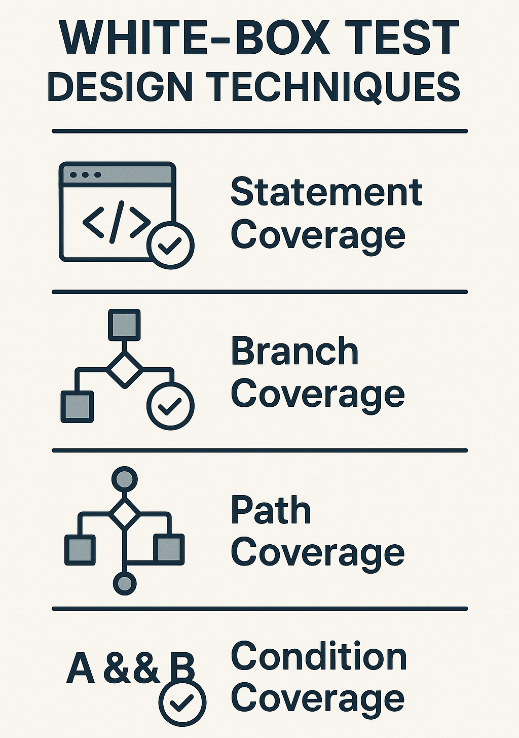 - White-box test design techniques or tructural techniques rely on knowledge of the internal code and logic of the system. These techniques ensure that the internal paths, conditions, and logic of the system are adequately tested.
